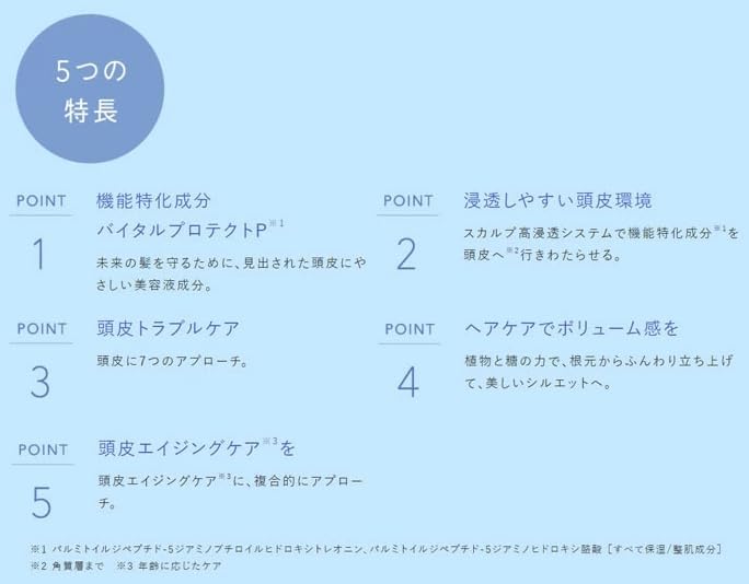 厳選された機能特化成分※1をすみずみまで※2浸透 乾燥する頭皮にうるおいを与えて、未来の土台を守る頭皮 用美容液。シンプルな処方設計で、厳選された機能特化成 分※1をしっかりと角質層のすみずみまで 届けるブースター成分※3も配合。またエッセンスをダイレ クトにまんべんなく行きわたらせるためにジェットポンプ を採用。手軽なスカルプケアを叶えます。 ※1パルミトイルジペプチド-5ジアミノブチロイルヒドロキシトレオニン、パルミトイルジペプチドー5ジアミノヒドロキシ酪酸[保湿/整肌成分] ※2角質層まで ※3ジラウロイルグルタミン酸リシンNa[保湿/毛髪補修成分]